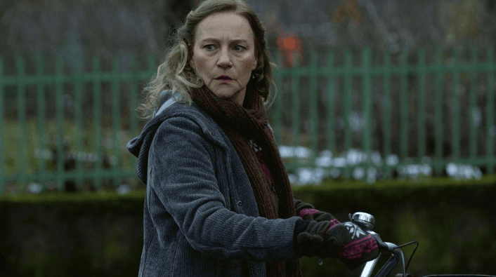 A mulher que vinha de bicicleta tem sua atenção despertada pelos gritos de Gunilla. Observa de longe enquanto o homem desfecha golpes. Veremos depois que ela, a única testemunha do crime, se chama Karin (Annika Hallin, na foto abaixo).