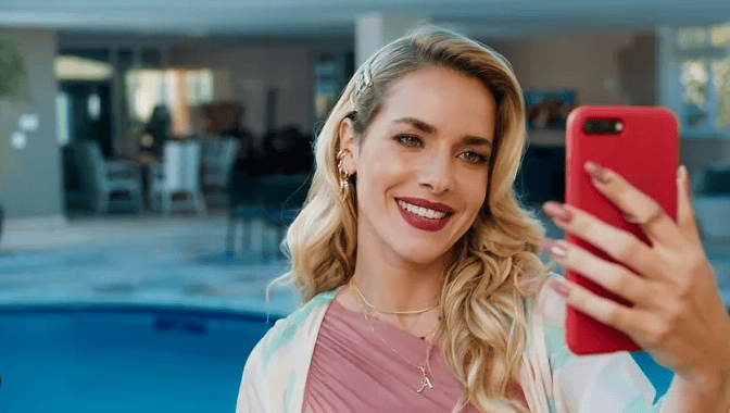 A base da trama é uma absoluta maravilha, um achado, e o roteiro a apresenta de cara, logo no comecinho do filme. A protagonista da história, Aimée, interpretada por Monique Alfradique, é uma socialite, dondoca, filha de milionário, que tem canais nas redes sociais. Uma influencer: fala bobagens sobre moda, beleza, viagens, com exatamente aquele jeitinho chato, bocó, das 231 mil influencers que há na praça, e que minha neta de 11 anos adora imitar…