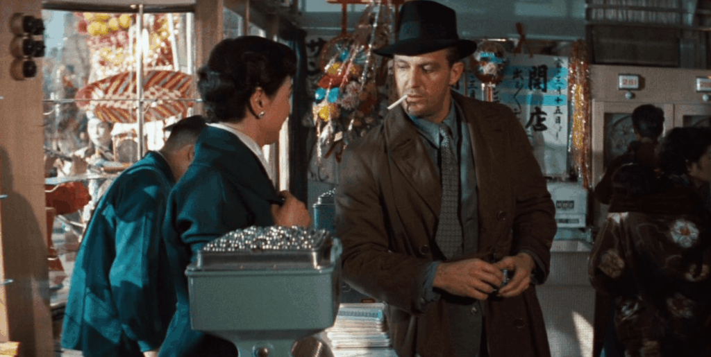 Não fica claro como é que aquele gringo recém-chegado poderia localizar uma mulher naquela gigantesca metrópole, mas o fato é que o mal-encarado Eddie Spanier consegue chegar a uma casa de banhos onde está Mariko (o papel da bela Shirley Yamaguchi). Ela percebe que o gringo está atrás dela, e foge. O gringo vai atrás – e acaba finalmente a alcançando na casa de seu tio, onde ela está vivendo.