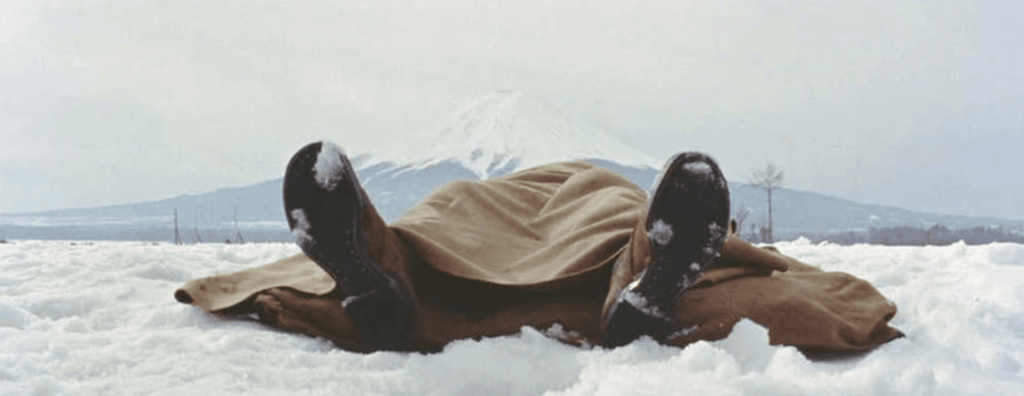 Enquanto a voz em off empostada dá aquelas primeiras informações para o espectador, vemos uma tomada geral de um terreno coberto de neve, o Monte Fuji bem lá atrás, junto do horizonte, e, na metade da grande tela retangular, um trem passando.