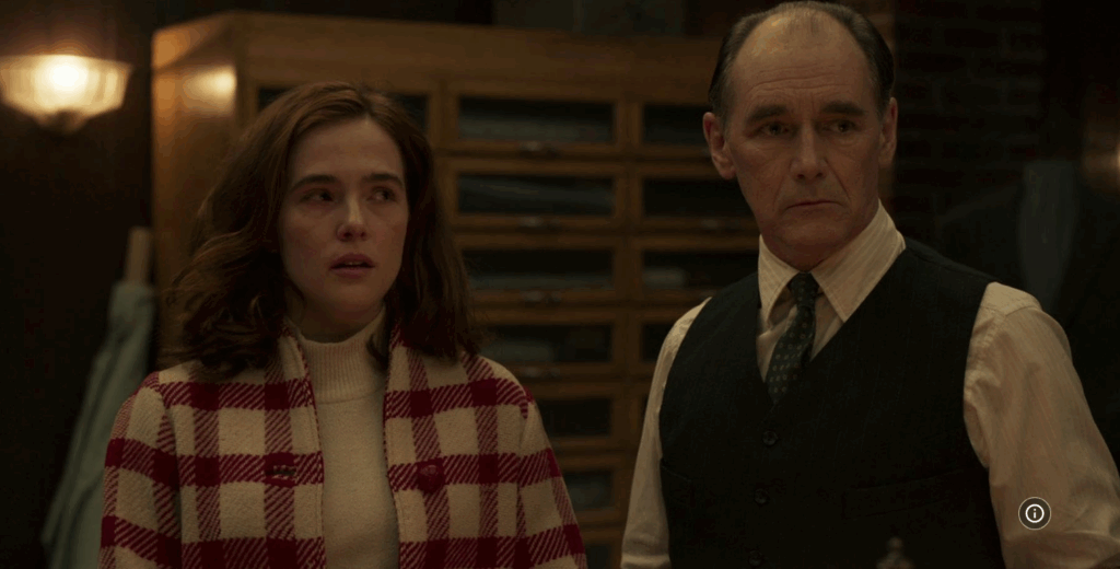 A bela secretária dele, a única pessoa que trabalha com ele na loja, Mabel (o papel de Zoey Deutch, na foto abaixo) o trata, é claro, como “senhor”. E tanto Richie (Dylan O’Brien), o filho de Roy Boyle, quanto Francis (Johnny Flynn), o homem de confiança do chefão da gangue, que estão sempre ali na loja, o chamam ou de “tailor” ou de “English”.