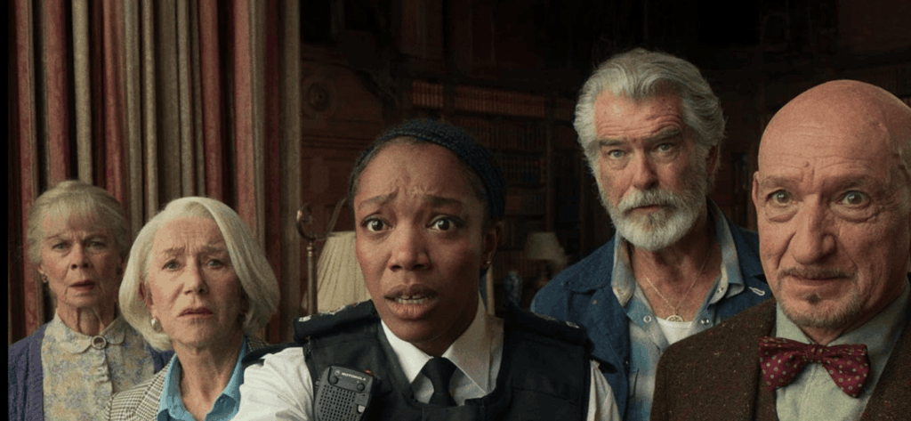 Falta falar da policial Donna De Freitas, o papel de Naomie Ackie (no centro na foto acima, entre, da esquerda para a direita, Celia Imrie, Helen Mirren, `Pierce Brosnan e Ben Kingsley).