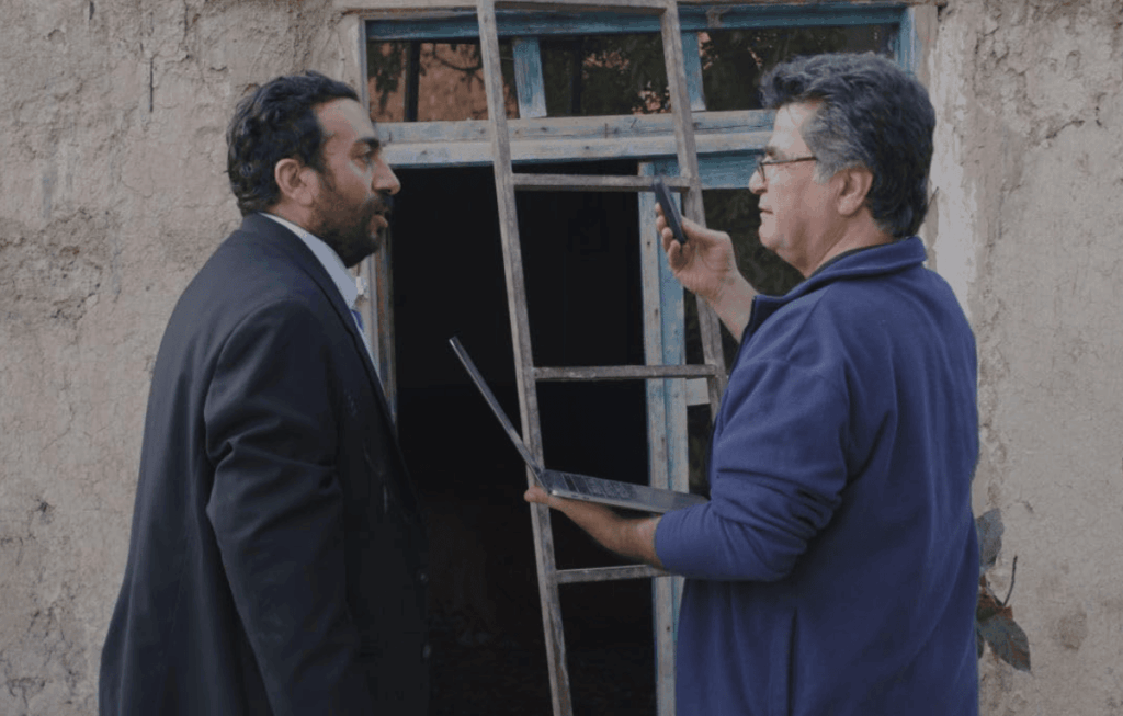 A conexão de internet cai. O cineasta sai de seu quarto, começa a andar pelo pátio externo, à procura de algum lugar em que volte o sinal da internet. Um homem surge para ver se pode ajudá-lo – veremos em seguida que é Ghanbar, o dono da edícula que Jafar aluga. Ficam os dois tentando achar um local no pátio em que a conexão volte (na foto abaixo).