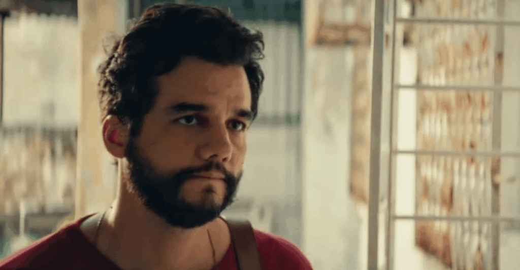 Elza é o papel da estonteante Maria Fernanda Cândido, que me pareceu tornada de propósito menos estonteante do que ela é (na foto acima). Ela aparece muito pouco na tela – creio que não chegam sequer a 10 minutos as sequências em que ela está –, mas seu personagem é chave na trama. É ela que operacionaliza a manutenção daquela rede de apoio a pessoas perseguidas. Menciona-se, bem rapidamente, que quem financia toda a rede, o prédio administrado por Dona Sebastiana e tudo o mais, é o pai de Elza, um empresário.