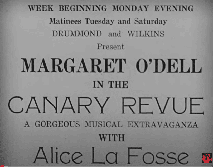 Antes da primeira tomada, logo ao final dos créditos iniciais, há algo como a reprodução de um cartaz na porta do teatro: “Margaret O’Dell em Canary Revue, uma suntuosa extravaganza musical com Alice La Fosse”.